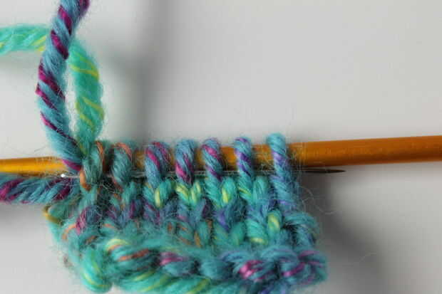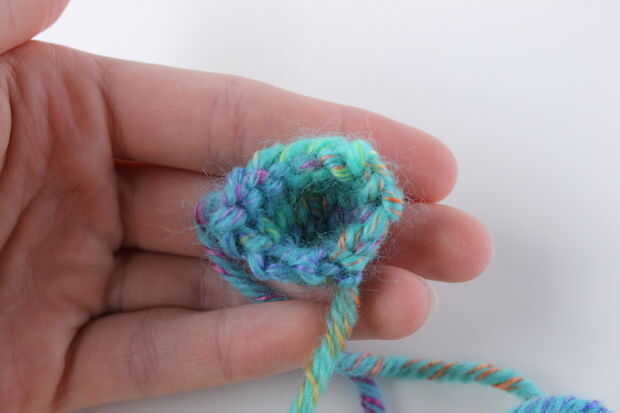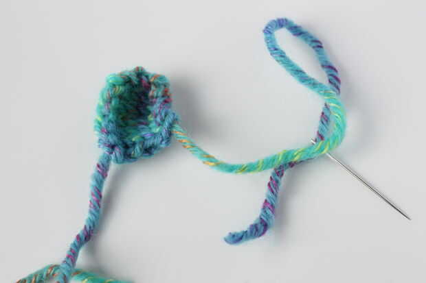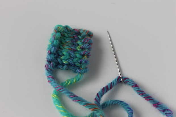 CO 7st A partir de k, st st 5 filas. Cortar el hilo dejando unos 10 strand cm (4 pulgadas). Utilizando una aguja de hilo, hilo de la hebra a través de la sts restantes. Tensar y atar.