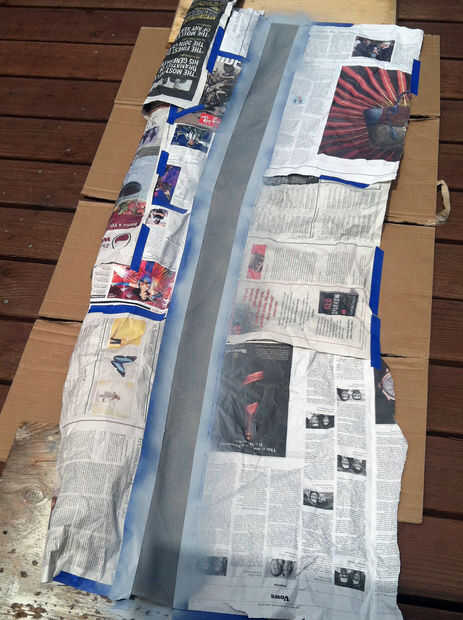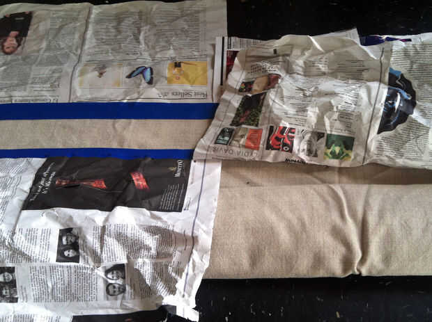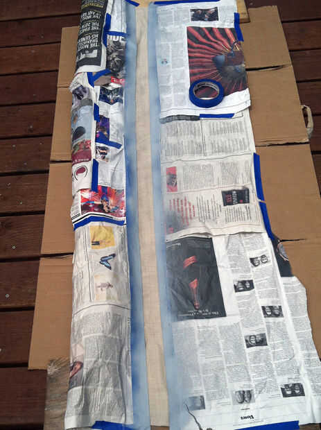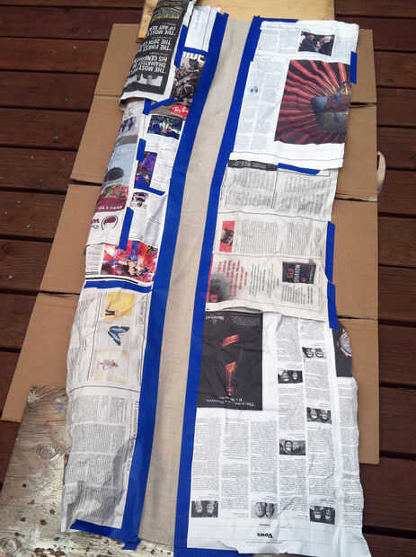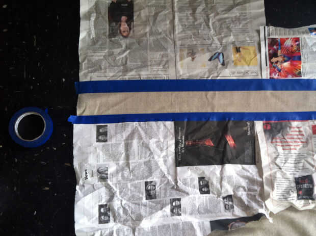 1. la cinta de la sección de la cobija que desea pintar asegurándose de esconder el resto de la manta con papel de periódico. Yo también cinta el papel de periódico hasta mi lona o cartulina porque hace mucho viento aquí y no lo quiero volar alrededor.