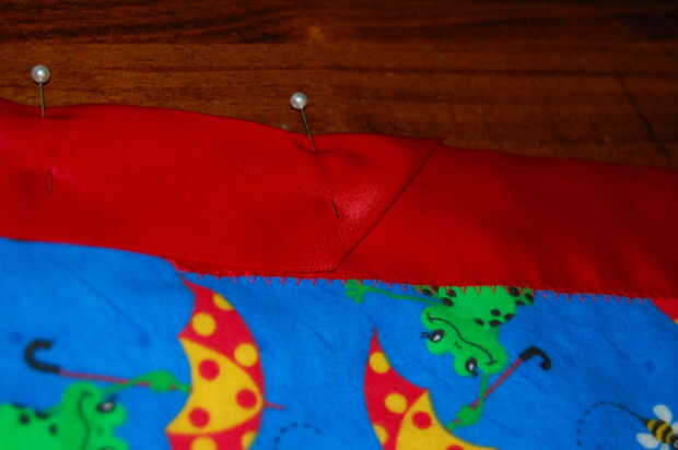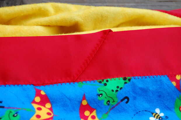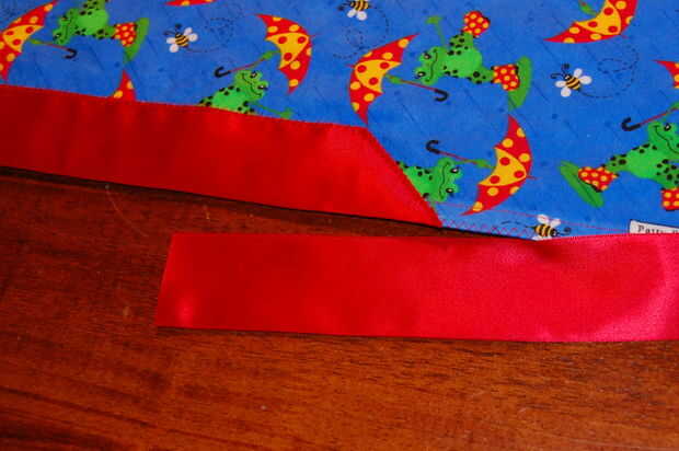 Acabado de fijar satén alrededor de la manta borde teniendo cuidado de asegurarse que la punta del satén con el borde de la manta. Coser la esquina como en el paso anterior y utilizar zz2 en el resto de este lado. Justo antes de la punta del satén, utilice zz1 (ida y vuelta) para fijar.