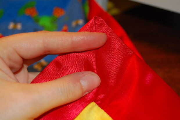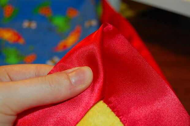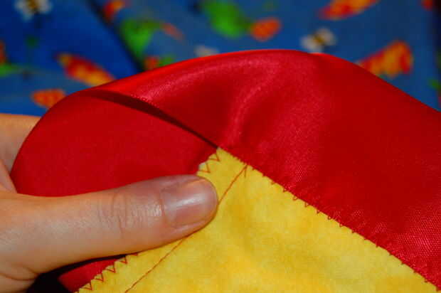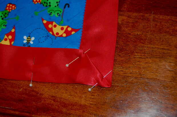 Puesto que el satén es muy resbaladiza, el plegamiento puede obtener un poco de funky. Generalmente pin la parte posterior de la manta y luego la parte delantera. Entonces ponga pasadores a través de todo el camino y quitar los primeros. El truco es conseguir los dobleces de 45 grados a la línea de arriba encima de la otra. Cuando cosa, desea que el zig-zag a horcajadas entre los dos bordes, para que los pliegues que tenga que ser simétrico a dentro de su ancho de puntada.