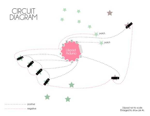 Estoy esperando este diagrama usted puede encontrar útil. Se ha cambiado el color de los pasajes de hilo por lo que sería claro que caminos tenían una carga negativa y carga positiva. Lilypad Arduino obviamente no está a escala, pero ampliado para que los títulos de pin se veía mejor.