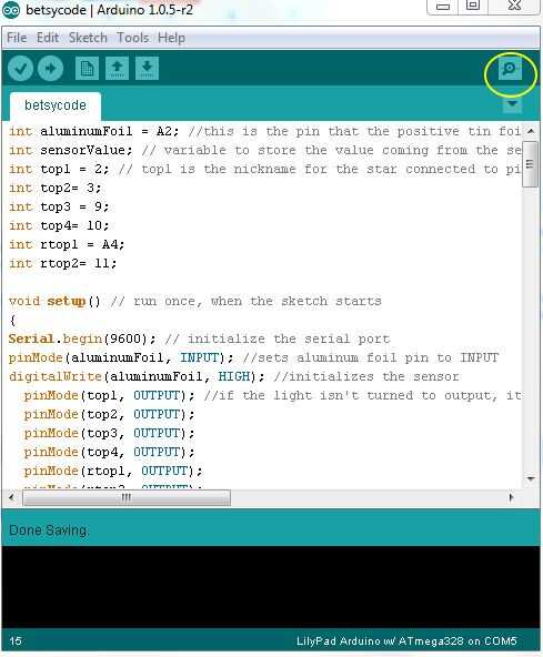 Una vez que los parches se cosen bien y su Lilypad está conectado al equipo mediante un cable USB, puede probar las gamas de los parches haciendo clic en el botón de monitor serial en la parte superior derecha de su código de Arduino. Asegúrese de que el USB apropiado es identificado en herramientas -> Puerto serie y que la placa Lilypad correcta está seleccionada en herramientas -> tabla.