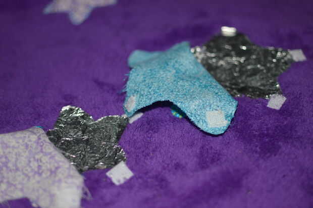 Consejo: Porque no me gusta el aspecto de la hoja de lata expuesta, me decidí a "ocultar" mis parches con estrellas de tela. Cosido un trozo pequeño de las dos estrellas sobre la manta, pero deje suficiente sin cosido de modo que las estrellas podrían ser levantadas (como puertas pequeña) y los parches podían ser tocados. Cosí en pedacitos de velcro (que era difícil y doloroso, por cierto) para que la parte abrible de las estrellas quedaba al ras de la manta cuando no esté en uso. También decidí cambiar mi código para que cuando la manta se enciende, las luces parpadean (en lugar de ser, como lo tenía antes). Esta manera, los parches de papel de aluminio no se utiliza demasiado sólo porque el usuario quiere algunas luces. Los parches por lo tanto sólo se utilizará cuando el usuario desea las luces para cambiar de velocidad. Me imagino que la vida de mis parches durará más tiempo así.