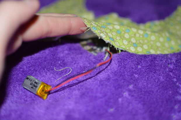 Sugerencia: Para ocultar mi lilypad, hice una luna e izquierda el medio plegado para que todavía ser capaces de la USB y la batería en sin mucha dificultad. Además, la batería tucks derecha en un lado de la luna. Ver imagen de abajo. Sin embargo, haré que deseo que yo hice algo con velcro en lugar de ello, porque a pesar de la gran apertura, era difícil ver mi Lilypad y encontrar el interruptor de encendido/apagado.