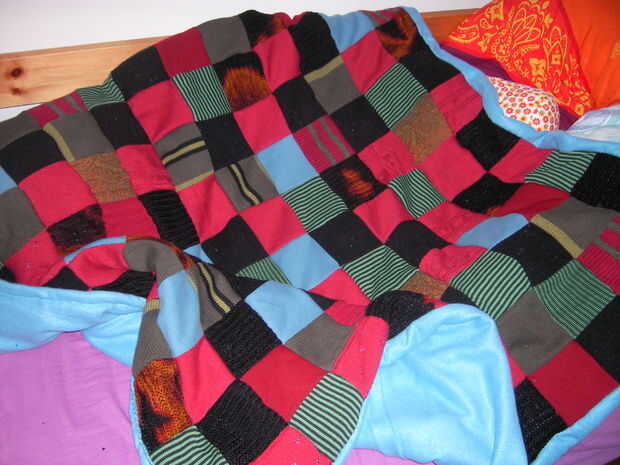 Como mi hermana siempre frío, quería hacer una manta como un regalo para ella. Pero como soy demasiado perezoso para hacer punto todas las plazas por mí mismo, recorte de jerseys viejos, cosía con la máquina de coser (primero en filas, entonces las filas de la Plaza) y coser una manta de lana para cubrir la parece en la parte trasera.