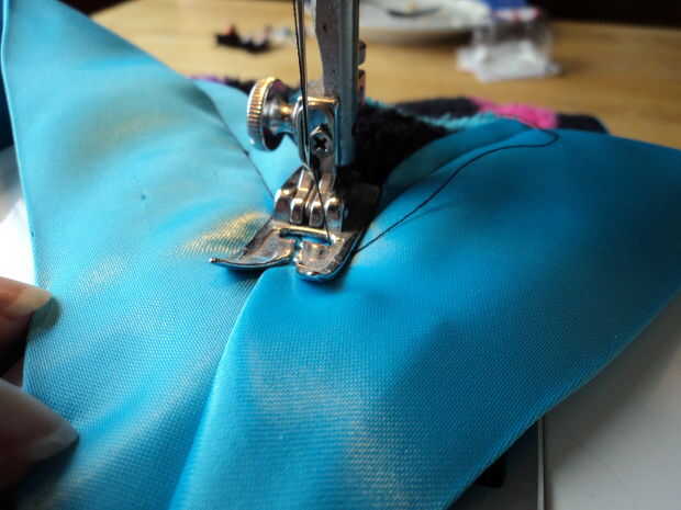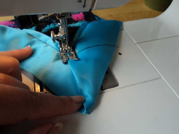 Después de haber cosido el enlace abajo, puede volver atrás y coser los pliegues en las esquinas también. Siempre no hacerlo, depende de lo limpio que son y si están buscando un poco demasiado hinchadas para mi gusto, cose hacia abajo.