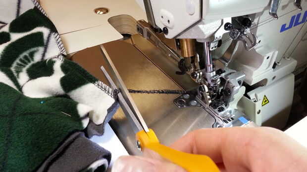 Al llegar al final de ese lado de la manta, continuar a coser justo delante de ella. Corte el exceso de su manta como cerca de la puntada como sea posible.