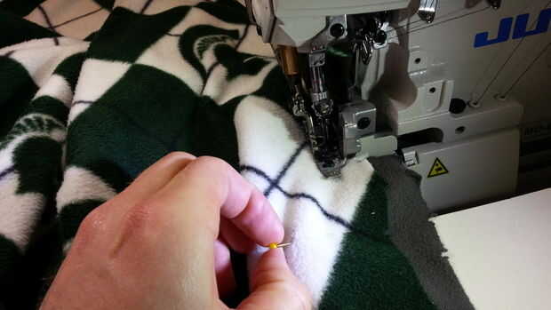 Comience con una esquina de la manta. La línea para arriba y un borde de serge. Cuando se llega a un pin, parar la máquina y retire antes de continuar. No ejecute un pin a través de la remalladora. Hay un cuchillo que recorta el borde de la tela, justo antes de las puntadas. Esto produce un borde limpio. Usted no quiere un pin para pasar por el cuchillo.