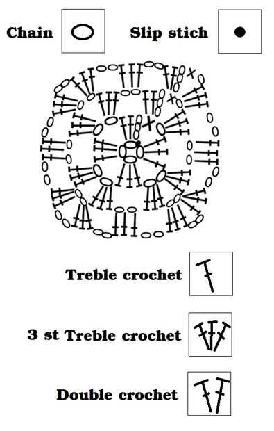 5- Hacer 3 doble crochet y agudos en la misma puntada de cadena. Cadena 2 otra vez, hacer otro 3 doble crochet/triples en la puntada de cadena y finalmente la cadena 2.