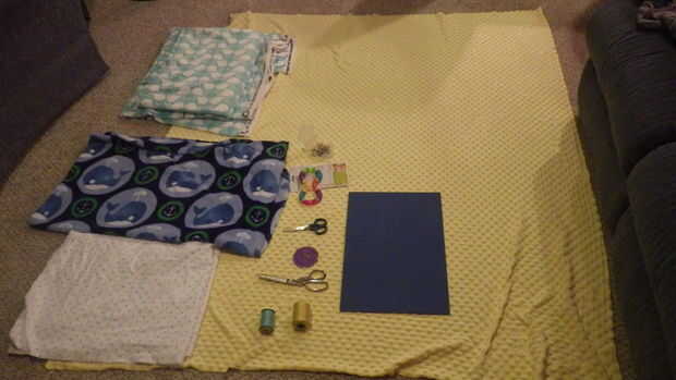 Para este proyecto se necesita material. Fui de Joann y Walmart también para el material. He comprado 1 yarda de la ballena grande y los puntos, de 2 yardas de la ballena pequeña y 3 yardas del amarillo. Necesita buena tijeras afiladas, alfileres, agujas de mano, hilo de rosca para que coincida con el proyecto, 3 arte grande de la espuma de las hojas (que pueden adquirirse en de Michael o de Joann. Utiliza para hacer plantillas). Una máquina de coser, un bebé sonajero / anillo de dentición, ojos, lápiz de marcador o marcador, cinta métrica y regla y seda del bordado negro o hilo negro doblado encima. Tipo de libre entregué este proyecto plegable cosas en cuadrados para hacerlos aun y corrigiendo cuando fui. Realmente no hice mucho de medir y así no tener longitudes exactas de cosas pero la manta terminó en 44" por 44".