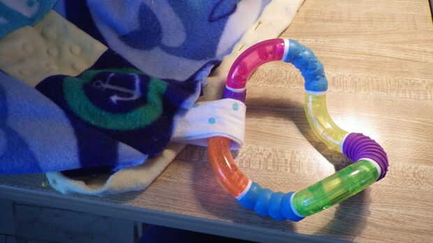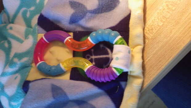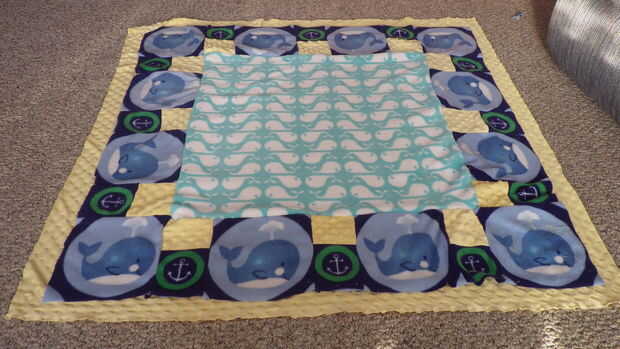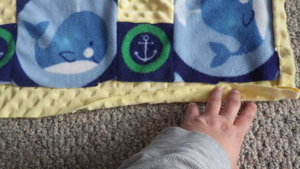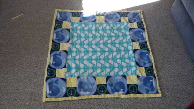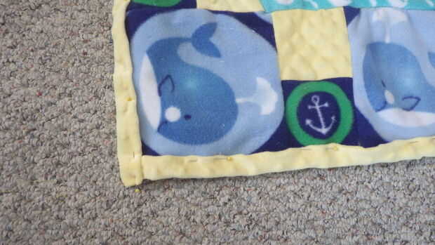 Cortar la parte de atrás me puso la parte superior de la manta sobre el material amarillo y cortar un cuadrado que era dos ancho de puntos alrededor del borde externo. A continuación, rodó una vez sobre sí misma y otra sobre la manta y puestas en lugar para ser cosidos. Una vez que llegué a la colocación de la sonaja envuelve el material alrededor de la sonaja y lo cosido a la parte inferior de la blanket.next envuelve el material amarillo sobre el soporte del traqueteo puntos y cubrió en lugar así. Luego coser un 1/4" desde el borde y cosidas a las esquinas en ambas direcciones, haciendo una especie de triángulo con los puntos de sutura. Que acabada la manta y luego fui al pulpo.