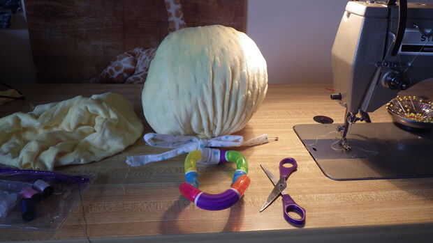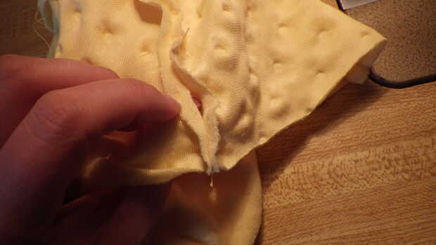 He creado la parte superior del pulpo con un patrón de tipo básico pelota de playa. Corte un trozo de espuma en la forma que se muestra; cortan 6 piezas forma el material amarillo. A continuación, cubrió y cosieron cada pedazo derecho contra derecho en un conjunto de tres y luego cosí los juntos uno por uno hasta que ya era una sola pieza. Entonces hice la cadena de drenaje cortando un trozo del material punteado más largo que el ancho de la cabeza y se cosen derecho contra un trozo de cuerda interior; La cadena hace más fácil girar a la derecha hacia fuera. Después, colocó la cadena a lo largo de la parte inferior de la cabeza e hizo un túnel doblando el borde sobre la cadena y costura. Me abrió una de las costuras en el centro del túnel lo bastante a tirar de los extremos de la cuerda hacia fuera posteriormente había reforzada de los bordes de la costura y cosido a mano los extremos de la cuerda para cerrarlo apagado. por último, prueba de ajuste la manta.