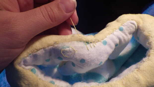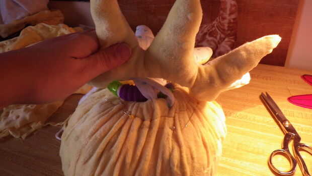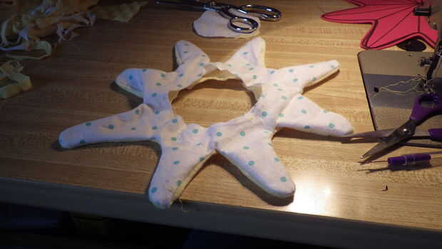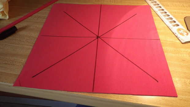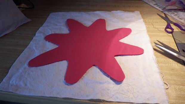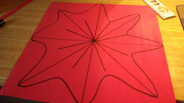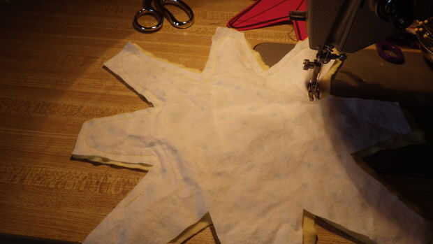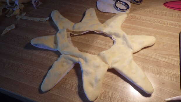 Corte un cuadrado de espuma de artesanía que es 12" por 12". Encuentre el centro de la Plaza. luego con una regla realizar 4 líneas largas de 12" a través del centro en un patrón de estrella. luego hacer 4 líneas de 6" a través del centro también en forma de estrella. Luego dibujar curvas desde la parte superior de las largas filas en la parte superior de las líneas cortas de los tentáculos. cortar la forma y luego cortar el material punteado de la forma de la parte inferior y el amarillo de la parte superior. Me corte los bordes rectos luego les curvado al coser para crear los bordes redondeados. Una vez cosidas corte un orificio en el centro de los tentáculos y les resultó. Relleno el material a continuación, mano cosió el borde interior para cerrarlo apagado. Por último abrí la cabeza aflojando el lazo a la anchura de los tentáculos y mano cosen al borde de la cabeza. Dejé de coser los tentáculos en las uniones donde la cara sería en la cabeza y una abertura a la izquierda pero reforzado a los lados de los tentáculos en la cabeza. Esto lo hice el lazo abriría un poco más entonces el ancho de los tentáculos.