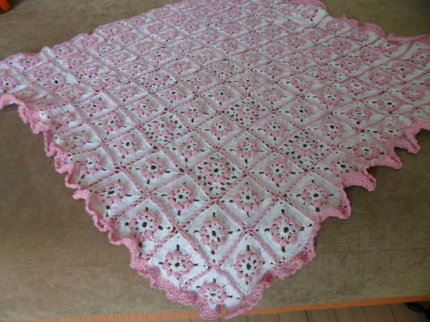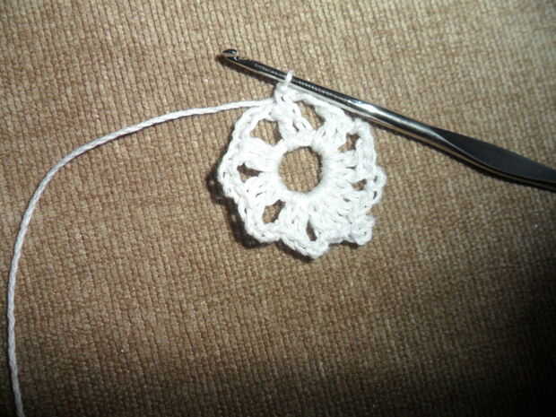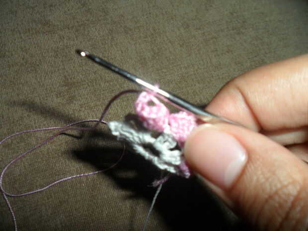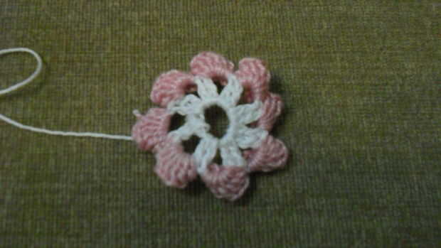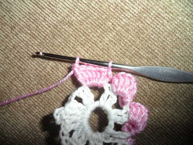 -no cortar el blanco y continuar con rosa y hacer la ch 3ch como un dc y completar hasta 7 dcs, introduzca la aguja en el primer y último dcs y cerrarlas para que una unidad de palomitas de maíz y luego hacer 3ch y hacer las palomitas siguiente en la cadena siguiente, y así sucesivamente hasta cerrar la ronda , terminar y cortar la rosa.