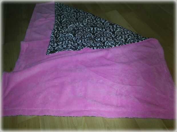 Ahora, sigamos con la manta. Emparejado a mi derecha en la parte superior de uno al otro haciendo que los lados que quiero visible están tocando juntos en el interior de dos telas. Luego cosí cerca a lo largo de los bordes dejando aproximadamente una pulgada 5 apertura que me permitió voltear la manta de adentro hacia fuera.