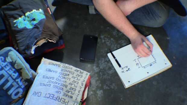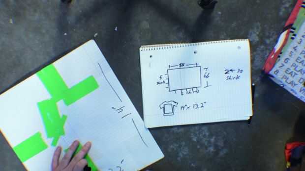 Decidir sobre su patrón y luego divídalo sus mantas por cuántas camisas hará para arriba, luego igual con la altura. Esto le dará el tamaño de sus camisas que usted necesita para cortar cada uno en el. Para facilitar esto, tome papel y corte (o más papel en la cinta) para hacer una plantilla. Sólo usé papel de mi cuaderno y cinta adhesiva.