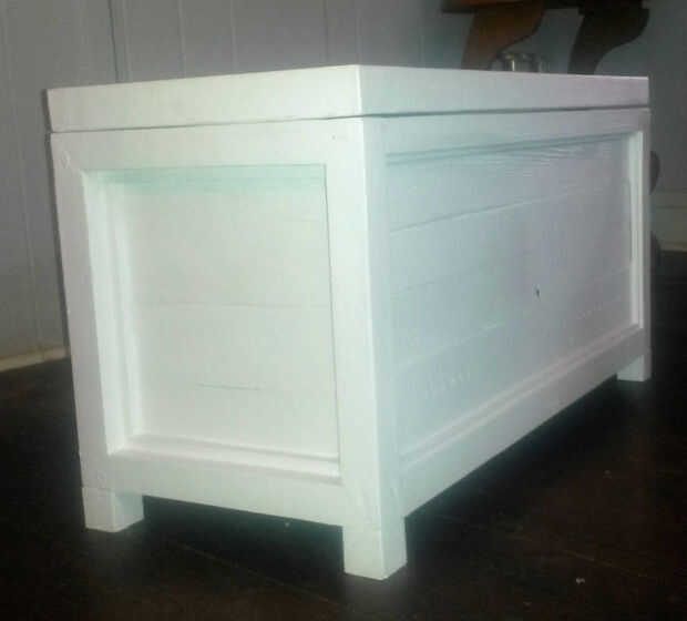 Cuatro plazas (cortadas de un taco cuadrado) en la parte inferior la levante ligeramente del suelo. Pintar. Añadir las bisagras y la manilla de la tapa. Y viola! Terminado!
