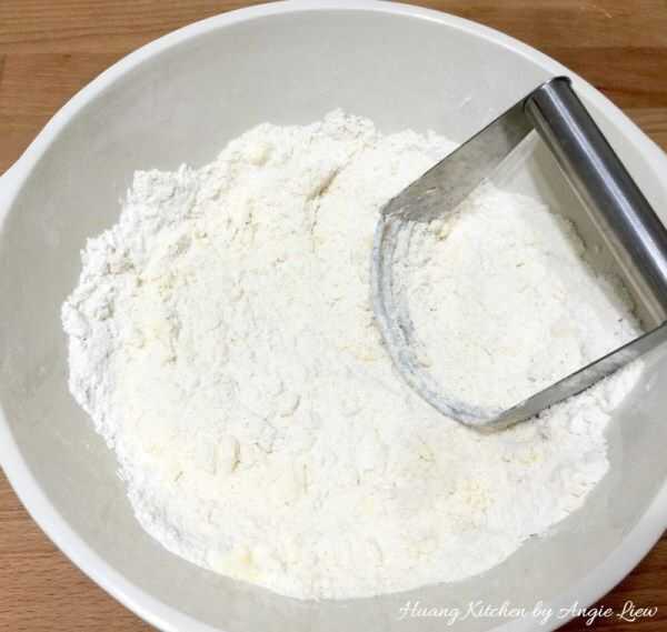 Paso 9: Con un cortador de pastelería, corte la mantequilla fría en la mezcla de harina hasta que la mezcla se asemeja a las migas gruesas.