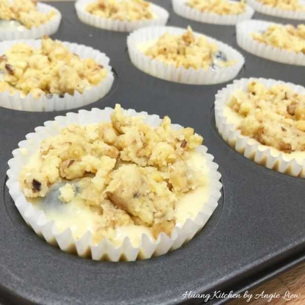 Puede usar tanto o tan poco del streusel para el relleno. Presionando suavemente sobre el relleno se asegurará que el streusel se pega a la masa.
