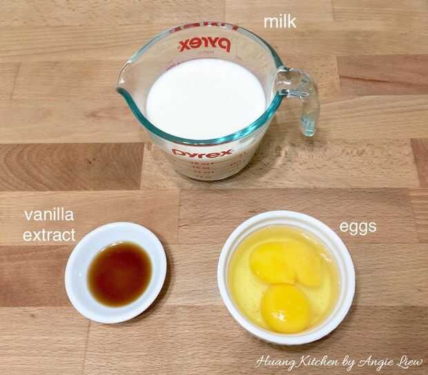 Para los ingredientes húmedos, uso 2 huevos, la leche fresca que puede ser descremada, completa o reducida grasa y extracto de vainilla que realzará el sabor de las magdalenas.
