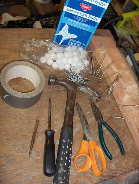 Además de la pantalla y bolas de la polilla, todo lo que realmente necesita es un par de tijeras, cinta adhesiva, implementos que hace agujero, algunos cables (utilicé cuadro colgante de alambre) y un par de cortadores de cable/pliars.