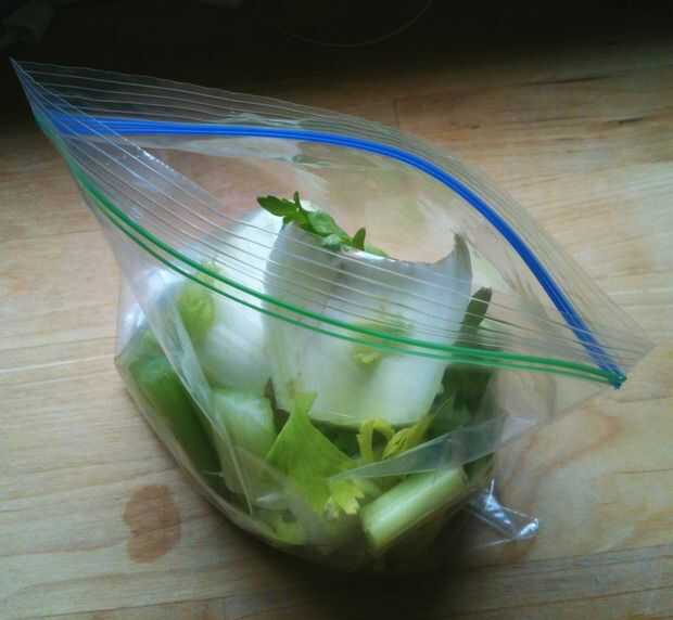 Picar la parte superior e inferior del apio! Guardar estos pedacitos en una bolsa ziplock en el congelador - son increíbles para hacer stock.