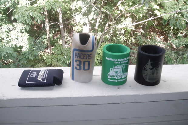 Echa un vistazo al cartel de coozies que he obtenidos alrededor de la casa. Hay dos tipos de materiales utilizados para hacer estos cuatro coozies. los dos a la izquierda son de neopreno, los dos a la derecha son una especie de grueso espuma de goma, de que no sé el nombre. ¿a quién le importa? ¡ queremos neopreno!