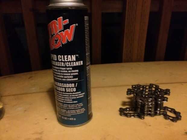 Limpie con el desengrasador de cadena la cadena a la medida de su capacidad. Me parece más eficiente para poner la cadena en un galón ziplock, rociando con desengrasante, luego agitarlo y lo masaje. Utilice una trapo o toalla de papel para luego limpiar la grasa.