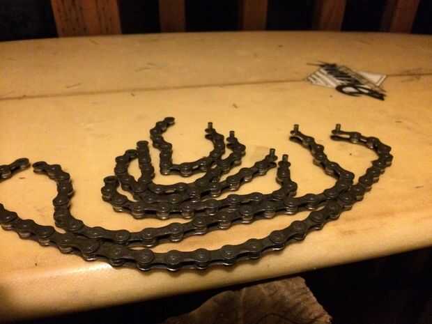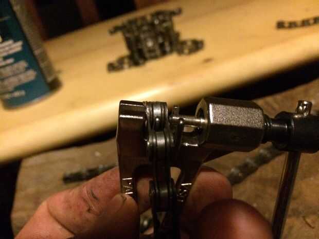 Si no has utilizado una herramienta de la cadena, la descripción áspera es que utilizas el pin en la herramienta de cadena para empujar uno de los pasadores de la cadena a través de la cadena hasta que sólo se celebra por un lado del enlace externo. No empuje el pasador completamente! En caso de duda, pare con frecuencia para tratar de separar la cadena. El enlace interno debe deslizarse fácilmente hacia fuera.
