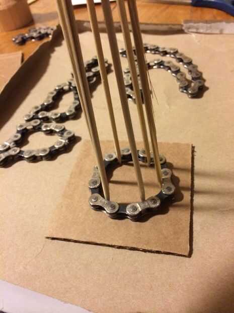 Utilizando una sola cadena de 12 enlace como un contorno, perforar el cartón con seis pinchos de bambú dentro de los enlaces más grandes. Luego perforar el cartón con los otro seis pinchos justo afuera fuera de los mismos enlaces.