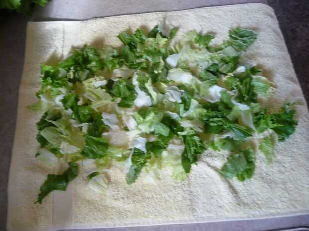 - Secar la ensalada verde con un centrifugador de ensalada o agitar vigorosamente en un buen colador antiguo y séquelo con una toalla de papel.