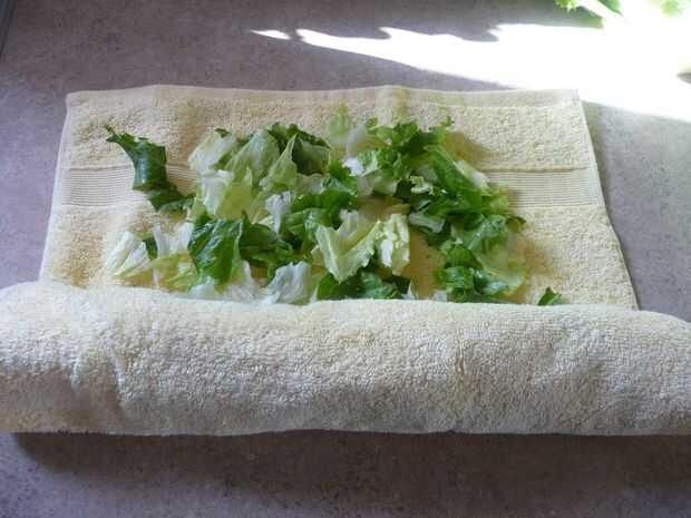 - El método de la toalla de plato es ideal si usted come mucha ensalada y tiene espacio en su refrigerador. Los verdes rasgados y enjuagados en una toalla de plato limpio (uno que no está cargado con suavizante ;-) la capa Enrollar la toalla y poner bandas de goma en cada extremo. Cuando estés listo para ensalada, tomar lo que quieras y enrollar el resto hacia atrás otra vez.