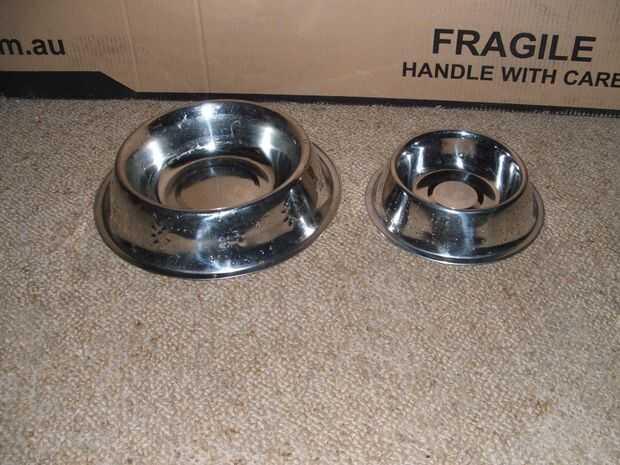 La taza más grande tendrá comida ni agua, mientras que el tazón de fuente más pequeño será invertida por debajo como una trampa de agua para esas hormigas no deseadas. Estos tazones de fuente particular generalmente tienen anillos de goma antideslizante alrededor de sus bases que tienen una vida útil muy corta, por lo tanto, su ausencia en estas fotos.