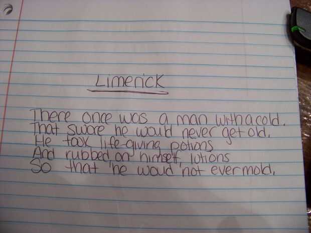 Limericks son un poco más difíciles, tienen que ser 8, 8, 7, 7, 8 y necesitan a la rima de A B B un patrón. Pero también son tan divertido!