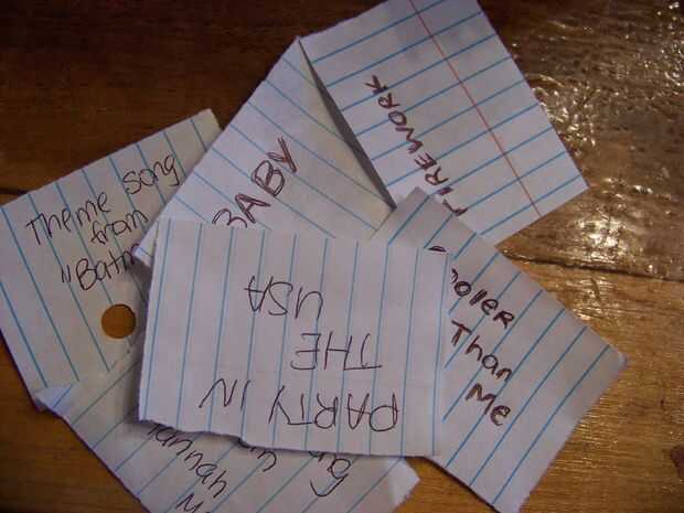 Para esto todo lo que tienes que hacer es hacer varios trozos pequeños de papel y escribir canciones populares sobre ellos. Cuanto más mejor.