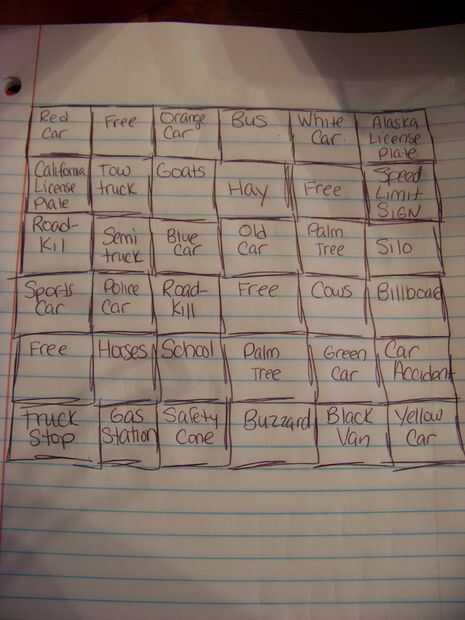Me encanta este juego! En primer lugar, todas la personas jugando hacer una cuadrícula. Puede ser 4 x 4, 5 x 5, 6 x 6, etc. como de todos los la red es del mismo tamaño. Hacer un reto extra por lo que es enorme! Ahora, todo el mundo toma vueltas con ideas sobre qué poner en las cajas. Una vez consensuado, el elemento entra en una de las cajas. Para ex. "Coche rojo" y todo el mundo pone "Coche rojo" en una caja en sus tarjetas BINGO. No te olvides de poner en algún sitio un par de espacios libres en la tarjeta. Ahora, comercio de tarjetas y empezar a caza las coches rojos!!!!
