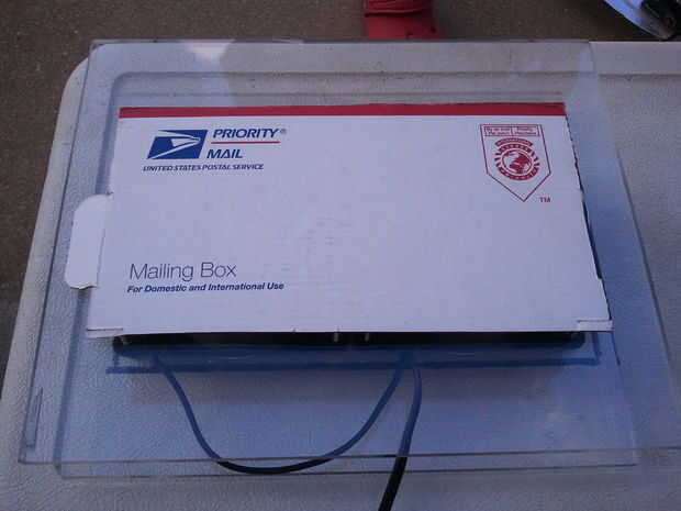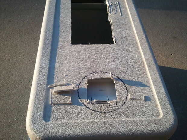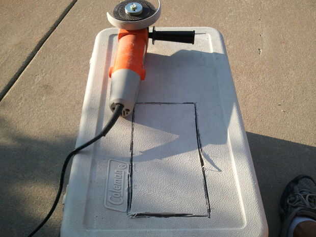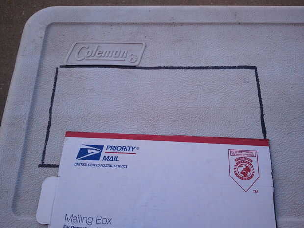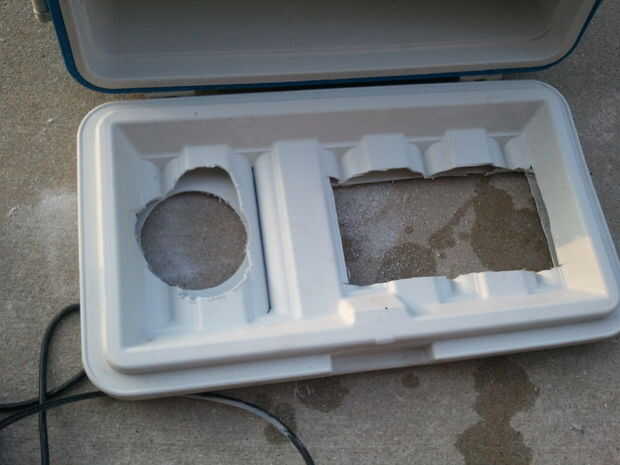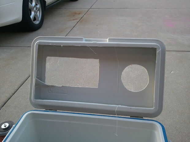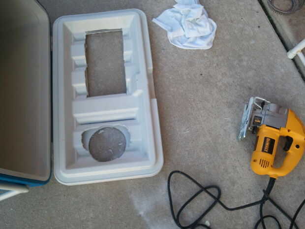 Ahora que los fans están fuera de la caja grande, tomé un pedazo de cartón y se indica un agujero ligeramente más grande que los fans, pero aún más pequeño que el plástico alrededor. También corté un agujero de la brida de inodoro en. Además, cuando terminé, completamente quité la parte inferior acanalada de la nevera, hace todo más fácil trabajar con.