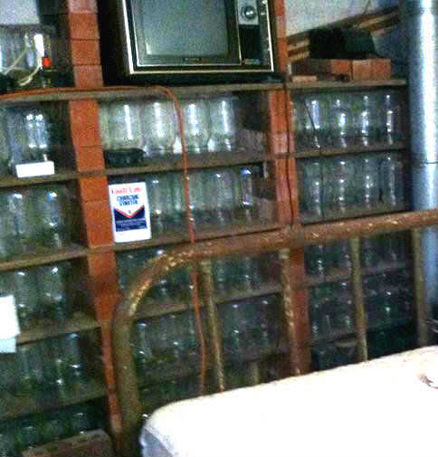 La bodega es también un gran lugar a tienda hogar conservada de frutas y verduras. Ver fotos de tarros de fruta en los estantes.