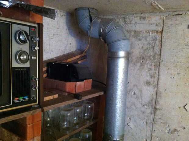 El abrigo subterráneo tiene orificios de 2 5 pulgadas de diámetro, uno en cada una de las esquinas posteriores. El aire entra en el ventilador a ras de suelo ya húmedo humedad se encuentra en el nivel más bajo. Es expulsado hacia arriba y hacia fuera a través de la tubería de ventilación. Calentador aire entrar la ventilación desde afuera para reemplazar el aire escape. El ventilador funciona 24/7.