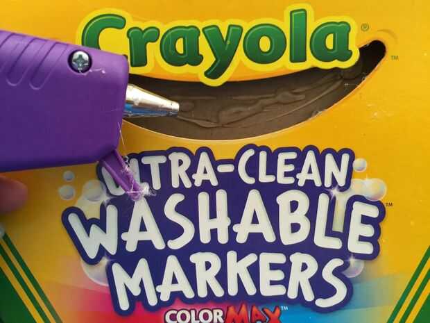 Agregar el pegamento caliente en el área abierta de la caja del marcador, se debe aplicar el pegamento rápido para no estar seco más tarde.