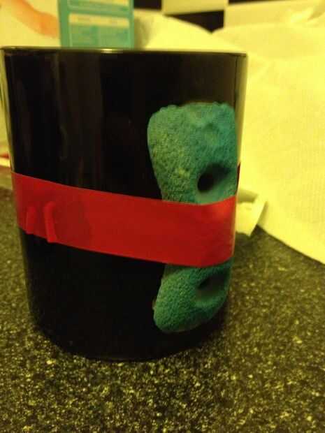 Mezclar una pequeña cantidad de pegamento y aplicar a la parte trasera de la bodega y luego la coloque en la taza. utilizar alguna cinta para sostener la sostiene en su lugar mientras el adhesivo se seque.