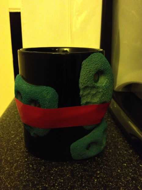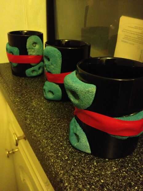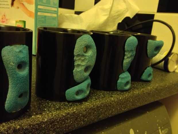 tengo un conjunto de diez bodegas y he utilizado siete hasta ahora solamente he decidido poner tres bodegas en las tazas que tienen un agarre difícil sostener lo que es difícil de beber de. Así que trabajé donde la tercera empuñadura iba a hacer posible sostener la taza y arena y arañado la superficie del esmalte para dar el pegamento algo aferrarse a, entonces mezcla una pequeña cantidad y pegado el hold en y mantiene en su lugar con alguna cinta. Repita en las otras tazas que necesitan un tercer apretón (o hasta que se de cuenta) así como facilitar las tazas para instalarle la tercera bodega de la taza hace las tazas que se parecen más a un muro de escalada. (Bueno creo que lo hace)
