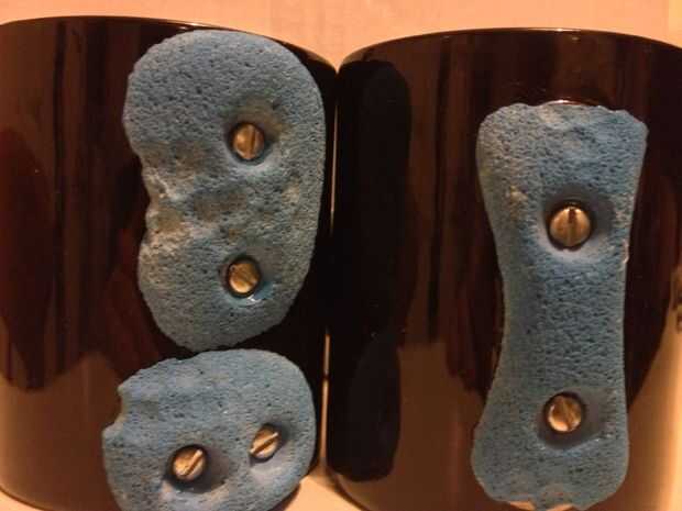 Después de que dejé todo el fresco de cabezas de tornillo tomé más de la resina de epoxy y pegar las cabezas de los tornillos en los orificios dentro de las bodegas para que se vea como se empernan a la taza. Hice esto en etapas, pega un par de pernos en una bodega en una taza y se trasladaron a otra taza dejando la primera taza de lado para que las cabezas de los pernos no caerse o resbalarse. Una vez que has hecho cada taza el primer set sería seco así que hice un segundo par en la primera taza. Repita hasta que todas las cabezas de los pernos se pegan en las bodegas.