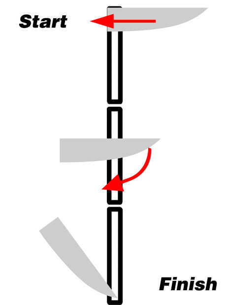 A continuación, utilizar más muñeca. Puedes ver que al final de la carrera en el acero la punta del cuchillo apunta hacia mí y cierre la de empuñadura de acero, sobre un pie delante de mi cuerpo. Mucho más seguro!