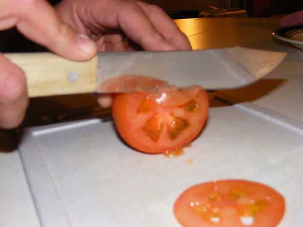 Cortar algo. Cortar un filete de este tomate muy merecedor, mal.