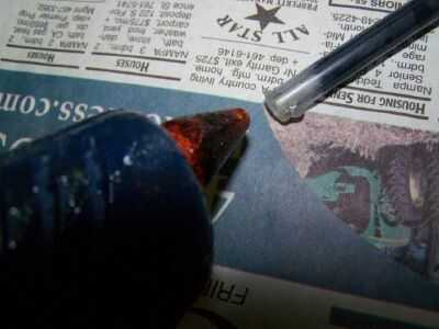A veces la tinta va hasta el final del cartucho y permanece allí por una acción capilar. Algo para romper la tensión superficial es necesario obtener la tinta fluya hasta el extremo de la punta del cartucho cuando comience a escribir. Corté una pieza de calibre #12 cobre alambre de 3/16 de pulgada de largo y se insertan en el cartucho. Lo general hace el truco muy bien. Puede oxidarse el acero y acero inoxidable sería bueno.
