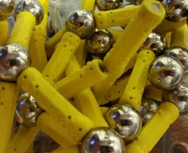 En caso de no llegar a través de ella, con Geomag es un juguete consistente en un conjunto de pequeños palillos magnéticos y cojinetes de bolas, que se pueden utilizar para crear estructuras geométricas. Es una gran cosa volver a utilizar ya que se puede encontrar barato en ventas y en ebay y los imanes son muy, muy fuerte. Cada palillo de geomag tiene un imán en cada extremo, conectado por una barra de metal y recubierto en plástico o metal dependiendo de la versión. Mi caja de la profundidad de los cajones de la mesa de trabajo es la variedad de plástico amarillo.