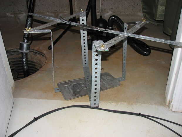 Motor de la bomba de pedestal no puede ser sumergida en el agua. Es importante mantener el motor muy por encima de la línea de agua más alta esperada en el sótano en caso de inundación pesada. Mantuvo 18" en mi caso. Tengo otros guardias de seguridad, que harán más adelante. El centro de gravedad de la bomba de pedestal es mayor, es difícil construir una plataforma estable con las herramientas de hogar. Usé las correas de 1 3/8" ancho ranurado para construir una plataforma. La plataforma se reclinará sobre el piso del sótano. Ángulo para tener una profundidad de 12". He creado una plataforma con placa vieja (libre de óxido). Me aseguré de que usé tornillos de latón para evitar la oxidación.