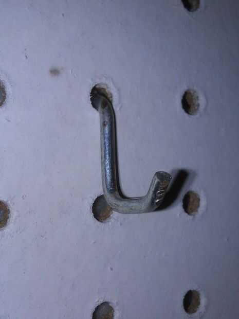 Pegboard en mi pared de la tienda tiene los agujeros más grandes de la pulgada 1/4 (o sobre). Mientras que los más gruesos ganchos de alambre y accesorios, que se realizan para el agujero más grande, un gran trabajo. El problema es no quedarse los ganchos de alambre más finos (sobre un 1/8 pulgada de espesor). Una herramienta de la pared del gancho agarrador y... ping ping, ping... el gancho está ahora por detrás del Banco o alguna otra herramienta... nunca para ser visto otra vez. He encontrado que a veces basta con estos anzuelos más pequeños porque no viene el calibre más grueso en los pequeños perfiles que se necesitan. Además, los ganchos más delgados son manera más baratos! Así, en la solución... o por lo menos mi solución, barato, fácil, rápido...