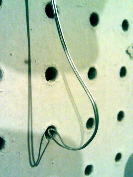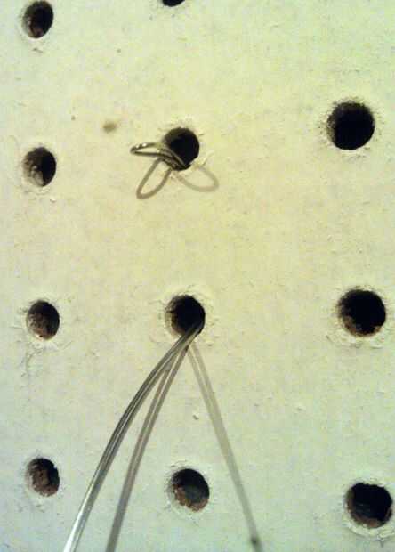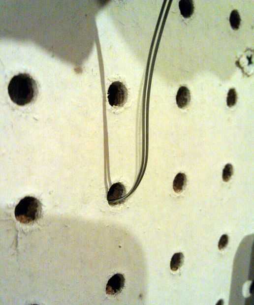 Alimentar el alambre en el agujero, que va a hacer una especie de balanceo vertical hacia arriba de la parte enganchada del cable detrás de la Junta hasta que se alimenta al a través del agujero superior. (Foto 3)